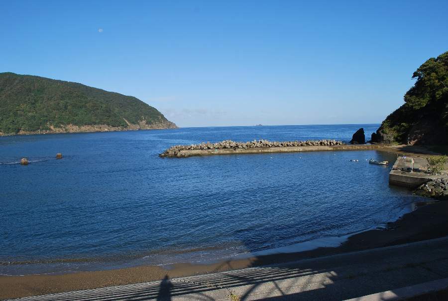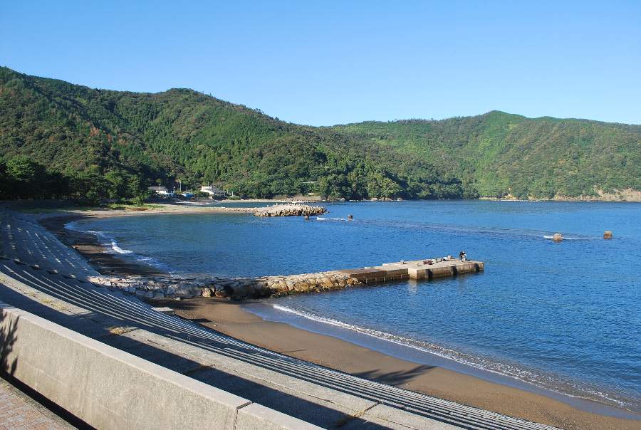 食見海岸は、波はありませんが沖合に波浪が見えます。