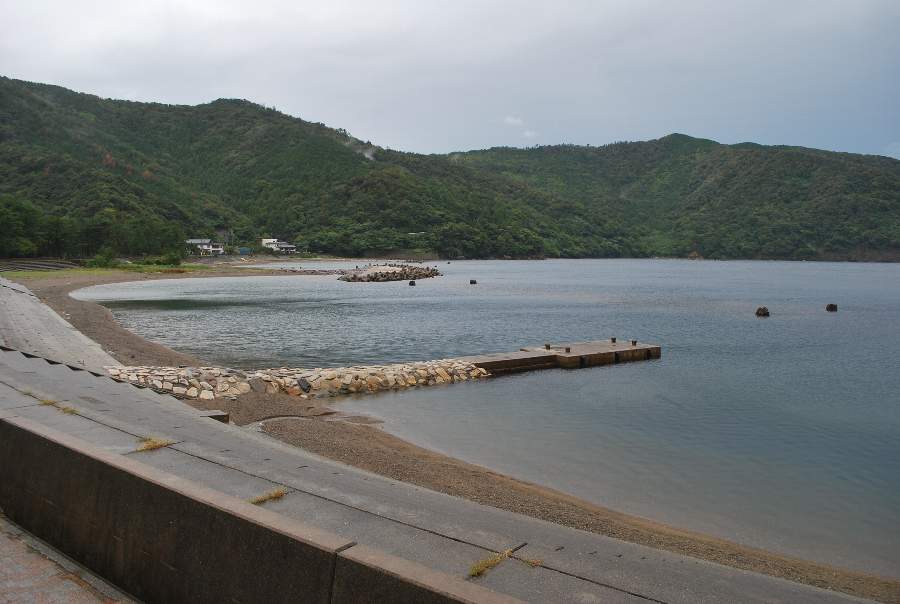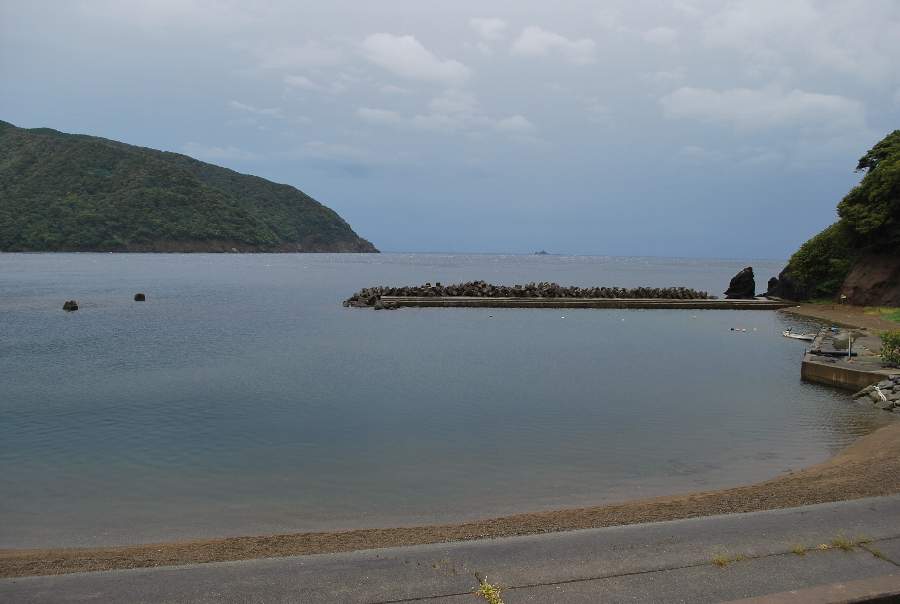 食見海岸は、波はありませんが沖合に波浪が見えます。