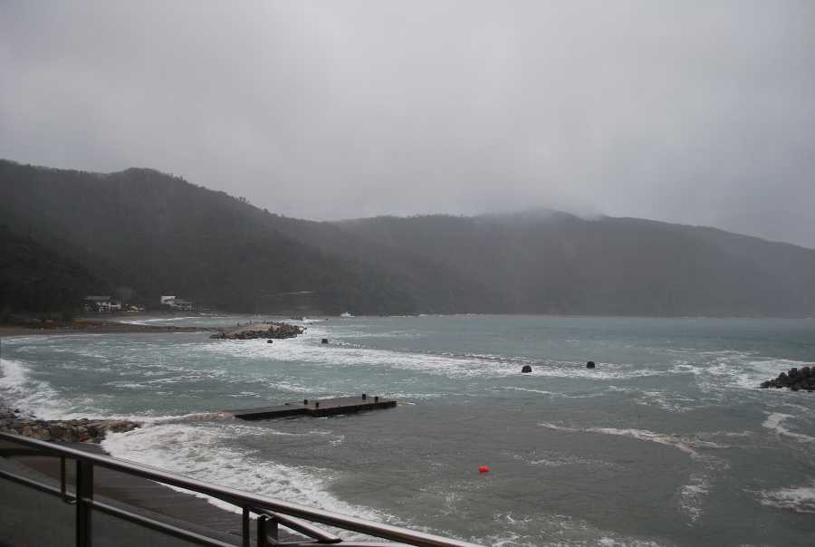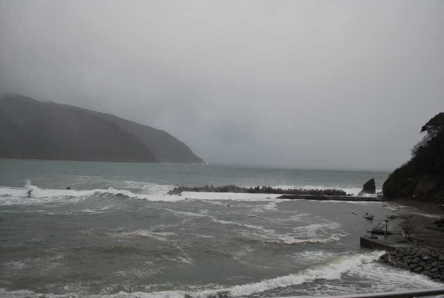 食見海岸は、約6mの波があり、大波が防波堤に被ります。