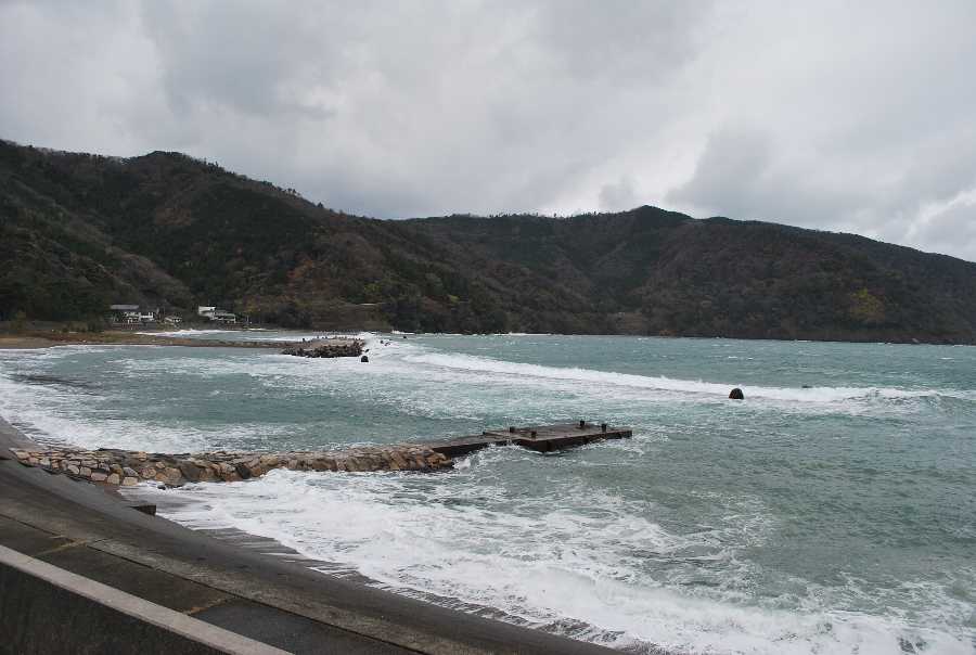 食見海岸は、約4mの波があり、大波が防波堤に被ります。