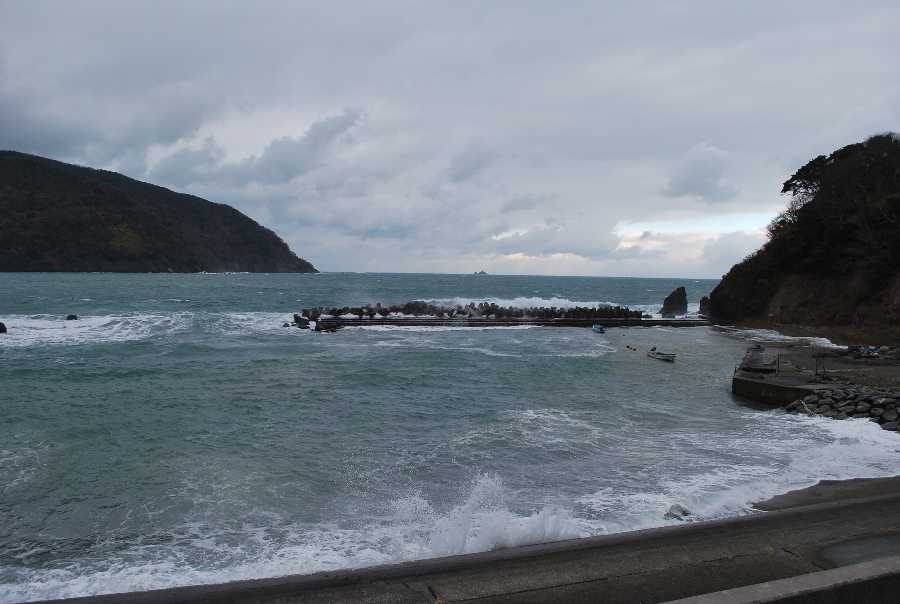 食見海岸は、約4mの波があり、防波堤に大波が被ります。