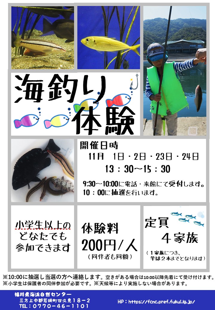 10月に引き続き、11月も1日(土)と2日(日)、23日(日)・24日(月・祝)に海釣り体験を開催します。当日受付になります。詳しくはチラシをご覧ください。