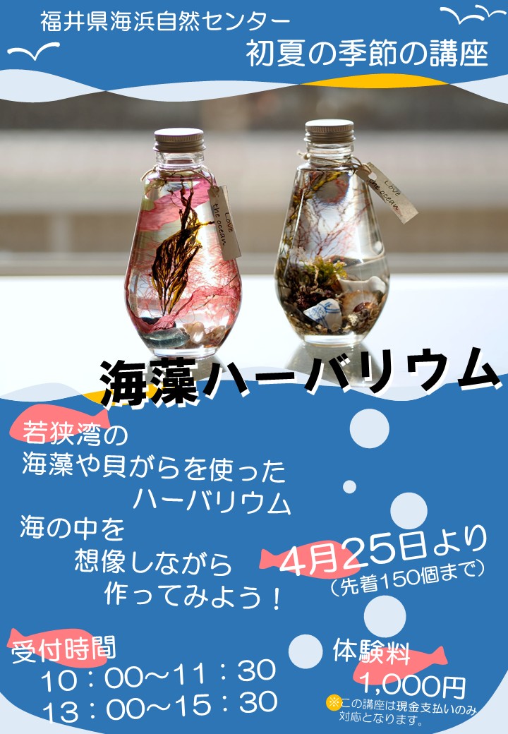 4月25日(土)から、若狭湾の海藻や貝がらでつくる海藻ハーバリウムづくりが始まります。